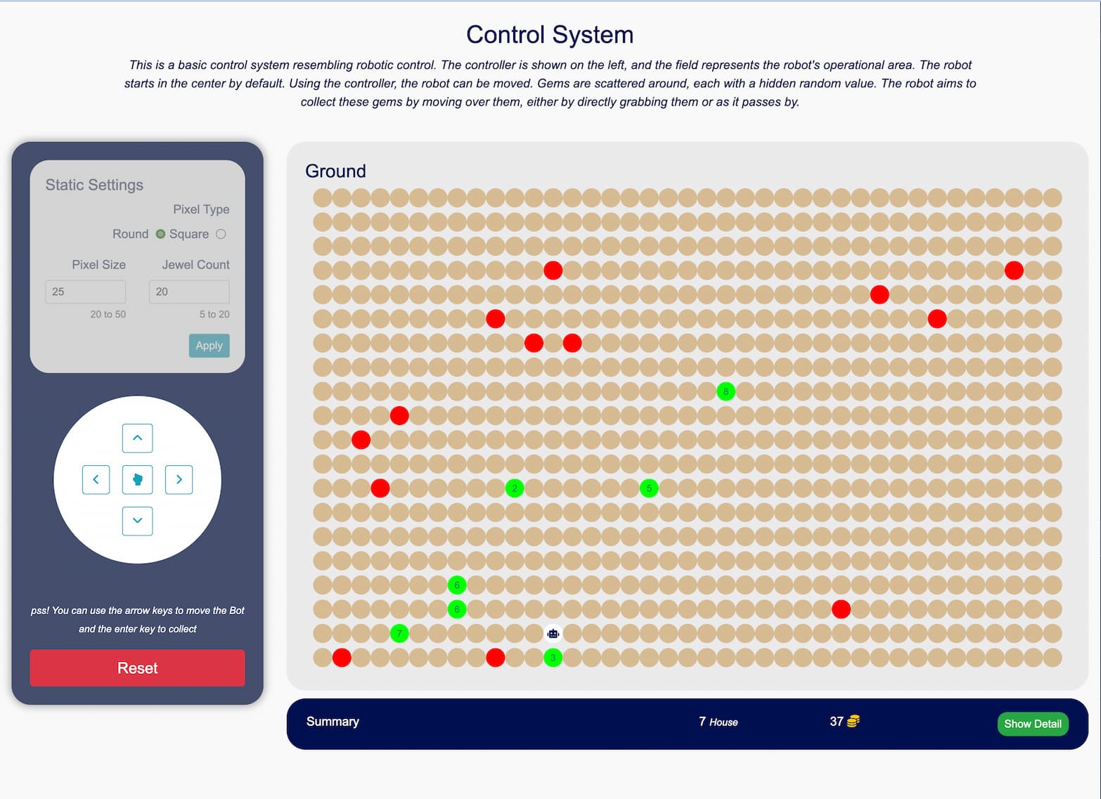 Angular, Typescript – A simple system that simulates a remote controller to guide a bot in four directions (up, down, left, right). The bot’s objective is to collect hidden-value gems scattered on a grid. Each gem’s position and value are recorded, and the bot’s movement is tracked. The system also includes an initial setup where users can adjust the pixel size of the grid before plotting the bot’s movements.